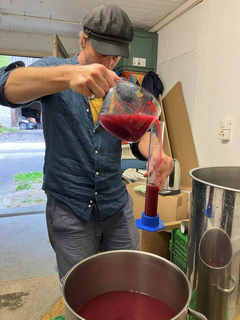 Nach drei Woche ist die Gärung abgeschlossen, alle Zucker abgebaut und die Farbextraktion zufriedenstellend ausgefallen. Nun wird die Maische abgepresst und zurück in den Edelstahltank gefüllt. Die Klärung der restlichen Trubstoffe werden wir weiterverfolgen und den Wein über den Winter reifen lassen. Abfüllen wollen wir diese erste Schaffung im kommenden Sommer.
