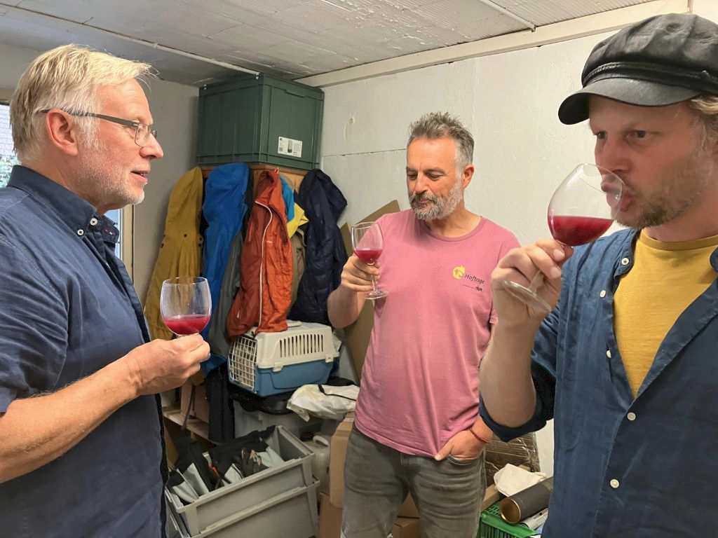 Nach drei Woche ist die Gärung abgeschlossen, alle Zucker abgebaut und die Farbextraktion zufriedenstellend ausgefallen. Nun wird die Maische abgepresst und zurück in den Edelstahltank gefüllt. Die Klärung der restlichen Trubstoffe werden wir weiterverfolgen und den Wein über den Winter reifen lassen. Abfüllen wollen wir diese erste Schaffung im kommenden Sommer.